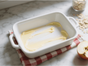 Lightly coat an 8 x 8-inch baking dish, or one of a similar size, with grease to prevent sticking. It also makes the baked oatmeal easier to remove and serve.