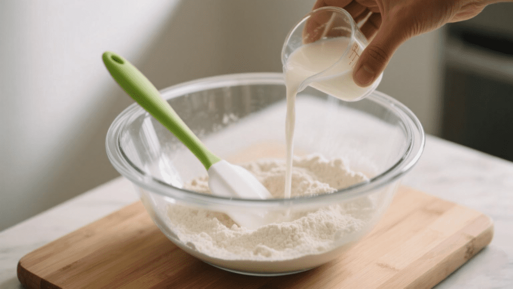 Pour a small quantity of cold buttermilk into the well. Mix exclusively in the center, using your fingers to make gentle circular motions. This technique slowly draws a small amount of flour from the walls into the liquid.