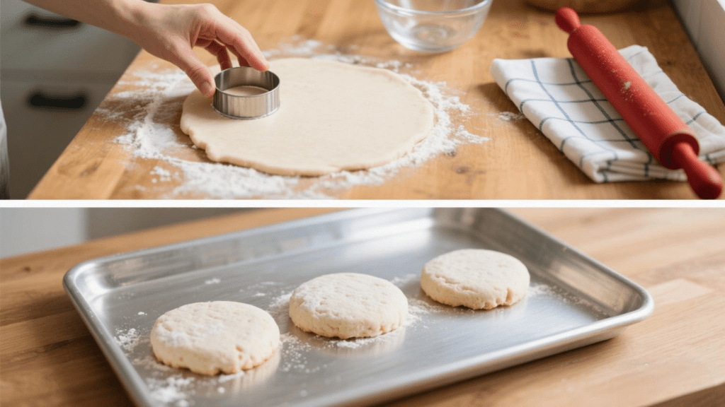 - Cut straight down: Press the biscuit cutter straight down without twisting. Twisting seals the edges and stops the biscuits from rising high.