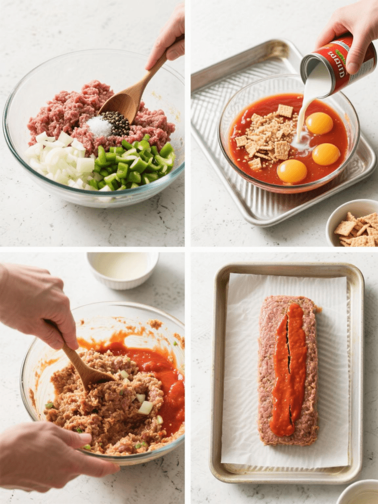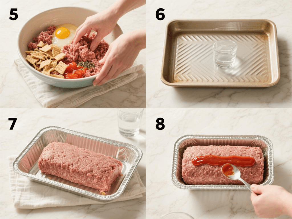 Step 5:Now, combine everything. Use your hands to gently fold the ingredients until they are evenly mixed. Ensure the tomato sauce and crackers are well incorporated, but avoid overworking the mixture. Overmixing activates the gluten proteins in the beef, which can make the meatloaf tough.