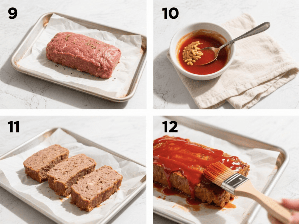 Step 11:After 45 minutes, remove the meatloaf from the oven. Spread the glaze evenly over the top. This adds sweetness and gives the surface a glossy finish.