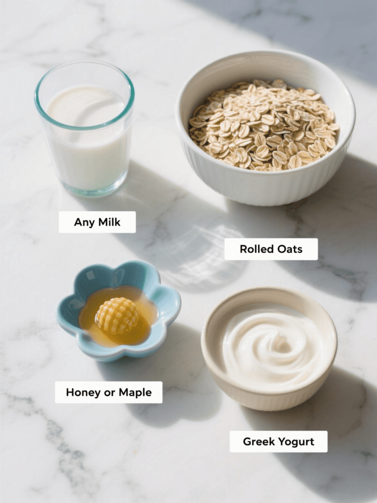 - Greek yogurt: plain Greek yogurt keeps the oats thick and satisfying. If you want even more protein, use low-fat Greek yogurt or Skyr. Dairy-free yogurt also works, but it makes the texture lighter. This ingredient shapes overnight oats with Greek yogurt, so I would not replace it.