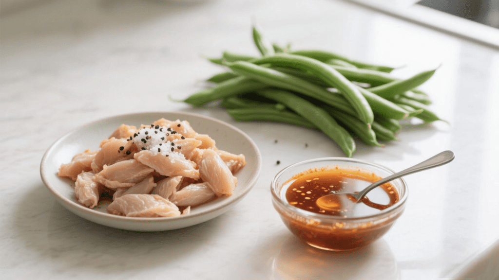 - First, season chicken with salt and pepper, then cut it into thin, bite-sized pieces. Set aside. Next, prep the green beans by trimming off both ends. Set aside. Prep stir fry sauce by combining coconut aminos, sriracha, chili past, and honey in a small bowl, then mix well. Set aside.
