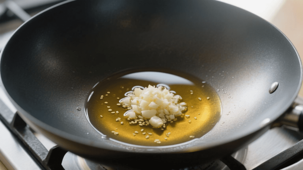 - Next, add 1 tablespoon of sesame oil and 1 tablespoon of minced garlic to a large sauce pan or wok. Set heat to high medium/high.