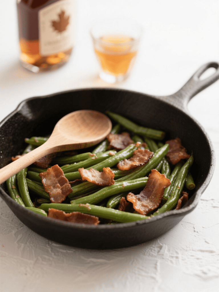 This Bourbon Bacon Green Beans recipe combines savory bacon with fresh green beans. Home cooks prepare it quickly and easily using a single skillet on the stovetop. The dish has become a favorite addition to Thanksgiving dinner tables because of its simple preparation and excellent flavor profile.