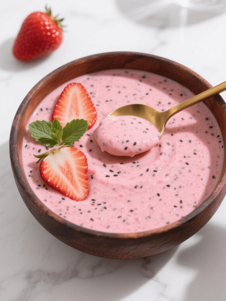 The recipe creates a chia pudding with yogurt that delivers plenty of natural fiber and protein. It uses only basic ingredients and requires no cooking whatsoever. Blended strawberries provide a fresh taste and smooth texture that feels comforting without being heavy.
