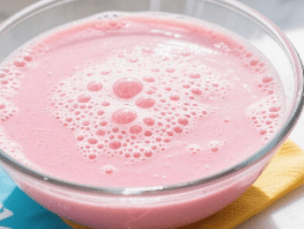 Blend the ingredients with an immersion blender until the mixture turns smooth and creamy. The finished blend should appear light pink.